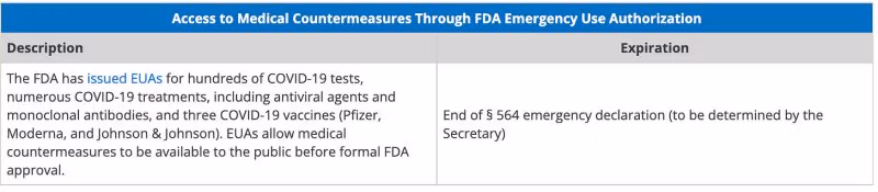 - Sanarwar gaggawa ta daban bisa ga Sashe na 564 na Dokar Abinci, Magunguna, da Kayan Aiki (FD&C) ta Tarayya Sakataren HHS ne ya bayar. a watan Fabrairu 2020. Dangane da wannan kuduri, akan Maris 27, 2020, Sakataren ya bayyana cewa akwai yanayi don tabbatar da hakan ba da izinin amfani da gaggawa (EUA) na matakan kariya na likita don COVID-19. EUA wata hanya ce don sauƙaƙe samuwa da amfani da matakan kariya na likita waɗanda aka ƙaddara don zama lafiya da tasiri amma har yanzu ba a yarda da su ba. Sanarwar gaggawa da aka bayar bisa ga Sashe na 564 na Dokar FD&C na ci gaba da aiki har sai Sakataren HHS ya kare. Lokacin da za a kammala EU shine a ƙayyade; ba zai ƙare a ranar 11 ga Mayu, 2023, tare da sauran sanarwar ba.