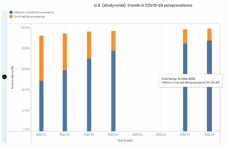Abin da CDC kwanan nan ruwaito (duba ginshiƙi da ke ƙasa), duk da haka, shine a ƙarshen 2023, a jimlace, aƙalla kashi 87% na Amurkawa suna da ƙwayoyin rigakafi na anti-nucleocapsid don haka sun kamu da cutar ta SARS-CoV-2, wannan duk da mammoth, tsawaitawa da sake maimaita kamfen ɗin rigakafin da ya haifar da kusan Kashi 90% na Amurkawa suna ɗaukar harbi. Hujjata ita ce ta hanyar yin manufofin da suka danganci adadin cututtukan da ke da fifiko mafi girma fiye da waɗanda suka dogara da mafi muni amma ƙarancin sakamako na kamuwa da cuta da lalacewar manufofin, manufar da aka ayyana na umarnin rigakafin don rage yaɗuwar ya gaza a cikin cewa kashi 87% na Amurkawa sun kamu da cutar ta wata hanya.