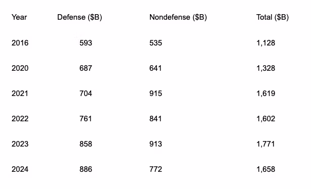 Don haka, a cikin sharuddan ƙima, haɗin kai na tsaro da rashin tsaro ya karu da kashi 47 cikin ɗari tun FY 2016—daga dala tiriliyan 1.128 zuwa dala tiriliyan 1.658 a FY 2024. Kamar yadda aka nuna a teburin da ke ƙasa, kusan kashi 40% na wannan riba ya zo kan agogon Trump da kashi 60% a ƙarƙashin Biden.