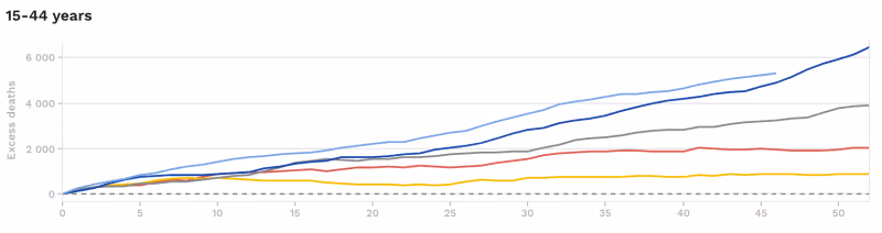 Yawan mace-mace ya bayyana a cikin shekarar cutar ta 2020 (layin launin toka), kuma a cikin 2021 (layin shuɗi mai duhu) lokacin da aka fara allurar rigakafi, amma har ma mafi girma a cikin 2022 (layin shuɗi mai haske), duk da cewa bambancin Omicron, tare da matsakaicin mace-mace, ya fara mamaye a wannan lokacin.