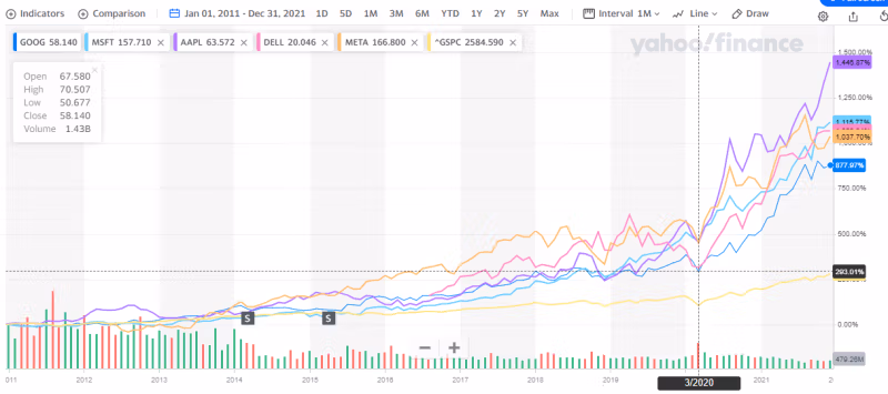 Babu inda wannan ya fi fitowa fili fiye da lokacin bala'in, lokacin da manyan kamfanonin fasaha suka mamaye lokacin don ceto tsarin makarantu da 'yan siyasa waɗanda rufe makarantu. Lura da aikin haja ga wasu manyan kamfanonin fasaha a cikin al'umma: Maris 2020 ya ga haɓakar fashewar Google, Microsoft, Apple, da sauransu. (Ya zuwa wannan rubutun, wannan kumfa ya fashe).