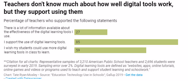 Babban imani a zuciyar turawa don ƙarin fasaha na azuzuwan shine wannan: fasaha, don kansa - yana da kyau. Wannan ya haifar da wani nau'in tunani na madauwari wanda ya ba da hujjar turawa don ƙarin ɗaukar allo da digitization na duk abun ciki, ba don wani dalili ba sai don samun damar isar da shi ta hanyar dijital. Kamar yadda kuke gani daga wannan sakamakon binciken, an goyi bayansa sosai, amma kaɗan da gaske sun sami ra'ayi game da tasirinsa.